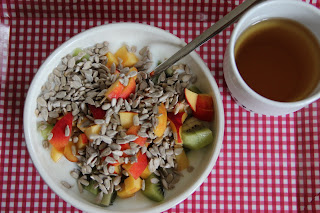 I natt trodde jag att jag skulle bli sjuk. Vaknade med halsont och en förkyld näsa mitt i natten. När jag sedan vakande i morse var halsontet helt borta! Vad hände där? Nu pepprar jag mig med c-vitamin för att fortsätta hålla eventuella sjukdomar borta. Min frukost idag innehöll kiwi, nektariner och äppeldryck.